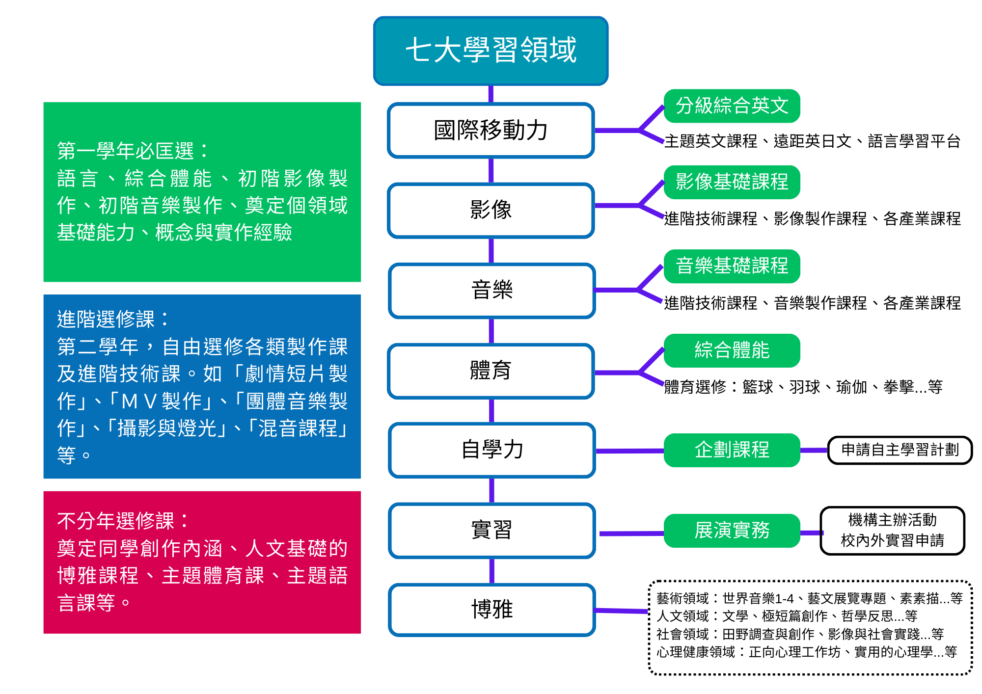 本機構的課程規劃以「七大學習領域」為方向,其中第一年以「必匡選」的概念以機構排課為主,讓同學在第一年完整接觸各領域的基礎。第二年起以自行選修為主。希望同學在每一季思考、規劃、選擇自己的個人課表,自己搭配選課、實習、自主計畫、組社團,累積自己的學習歷程,檢核自己的學習成果,逐步發展你/妳的學習路徑。